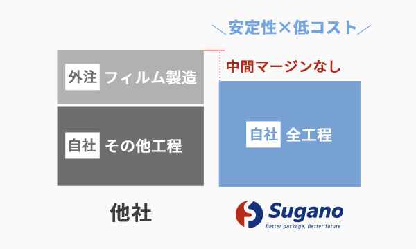 Suganoでは、企画・デザインからフィルムの製造、製袋、印刷、物流まで、「包装」にまつわるあらゆる⼯程を⾃社でワンストップで対応しています。