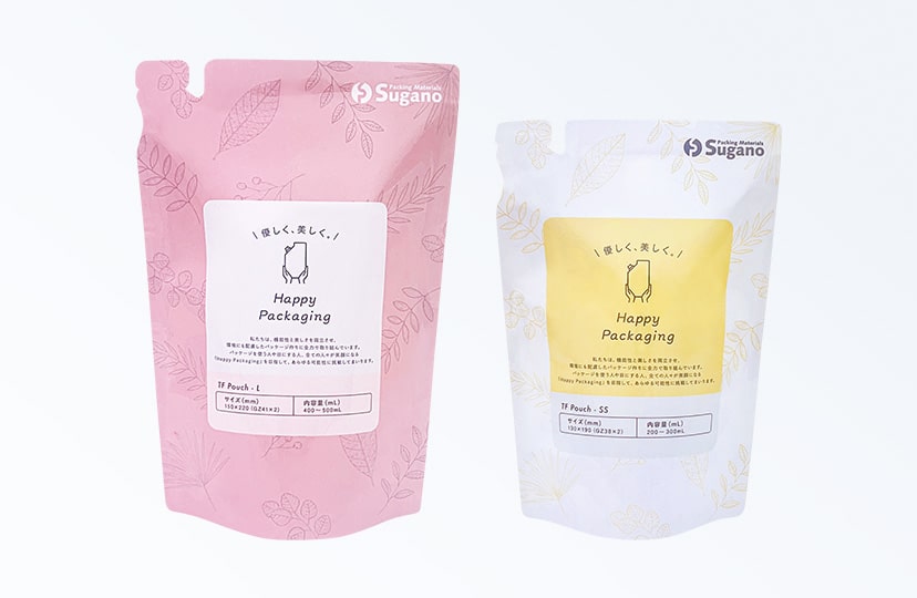 TFパウチとは、「TransFormer(トランスフォーマー)パウチ」の略称で、ハサミを使わずに手で開封できる注ぎ口が付いています。詰め替え用パウチとして多く利用されています。