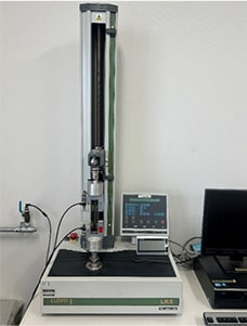 サンプルに引張荷重を加えた時の変化を測定する装置です。引張荷重を加え、サンプルが破断されるまでの結果を測定し、シールの強度が内容物に耐えうるか確かめています。