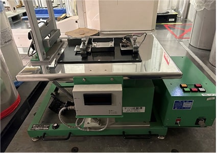 商品が入った状態で陳列(パレット積み)した際に、滑り落ちないか確認する機械です。