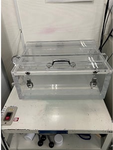 試験機内の空気を真空にして、フィルムの変化を測定する機械です。しっかりシールできているか、密閉性等を確かめることができます。