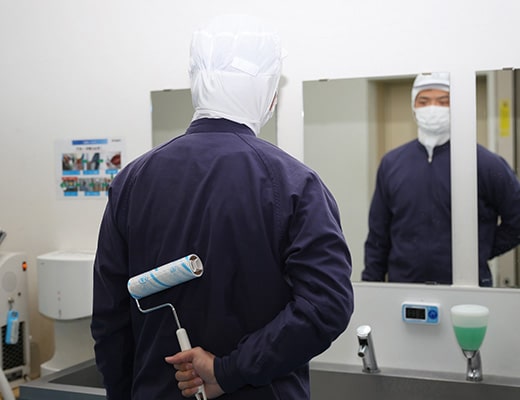 「異物を持ち込まない」ことを徹底するため、毛髪やほこりを粘着ローラーを使用して取り除いています。