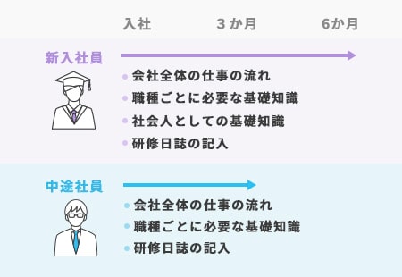入社後に、新卒採用は半年間、中途採用は3か月間の「新入社員研修」を実施しています。会社全体の仕事の流れや職種ごとに必要な基礎知識、新卒採用者は電話対応や名刺交換などの社会人としての基礎知識など、安心して仕事が始められるよう手厚くサポートします。