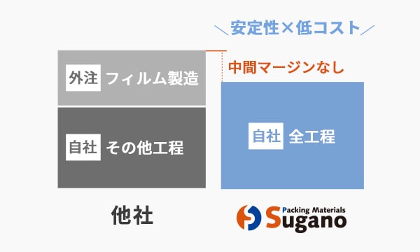 さらに、安定的な⽣産が実現できるうえ、中間マージンがかからずコストパフォーマンスの⾼いサービスをご提供できることも、⾃社でフィルムを製造できる⼤きなメリットです。