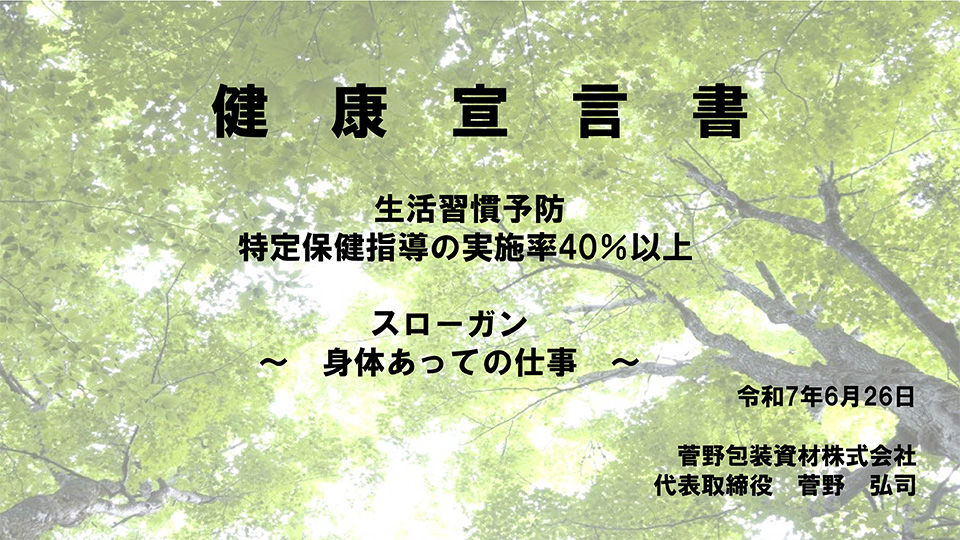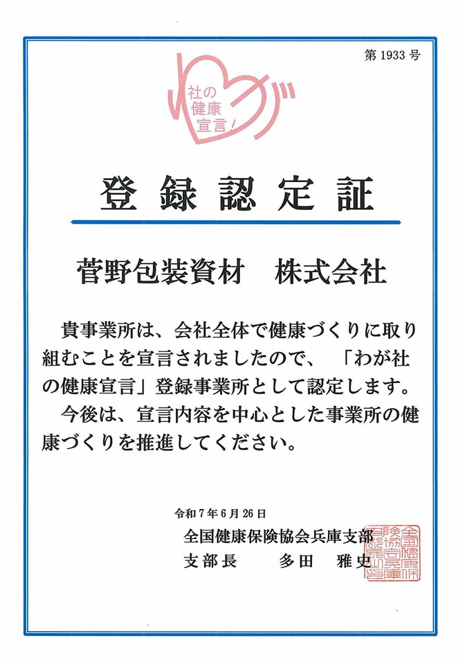 ホームお知らせ健康宣言および認定のお知らせ 健康宣言および認定のお知らせ|お知らせ お知らせ News 2025.07.17 お知らせ 健康宣言および認定のお知らせ 従業員の健康管理を経営的な視点で考え、戦略的に実践します。経営理念に 基づき、従業員の健康保持・増進に取り組むことで、組織の活性化や生産性の向上、企業 価値の向上を目指します。 一覧へ戻る CATEGORY お知らせ ARCHIVE 2026 2025 製品紹介 Products ボックスパウチ 抜群のディスプレイ効果&機能性で、商品の魅力を引き立てる プロテイン ペットフード スパウトパウチ スタンド袋 活用方法は無限大。大容量もお任せください トイレタリー品 食品 レトルトパウチ スタンド袋 耐久試験をクリアした、高品質なパウチのみをご提供 カレー パスタソース 三⽅シール袋 三方袋 容量・用途を問わず幅広い商品をパッケージ 合掌袋 合掌 徹底した品質管理で、安心・安全なパッケージを製造 四柱袋 合掌 高級感を演出できるマット印刷にも対応 ロール出し袋 スリット品(自動包装用フィルム) 商品を詰める際の負担を減らす工夫を詰め込んだ製品 レンジパウチ スタンド袋 自立して陳列できるため他商品と差別化しやすい 製品スペック⼀覧 事例紹介 Suganoについて 工場・設備紹介 お問い合わせ Contact こんなパッケージが欲しかった!を叶える、オーダーメイドのパッケージを製造しています 0790-49-0405[受付] 8:00~17:00(土日祝を除く) お問い合わせ