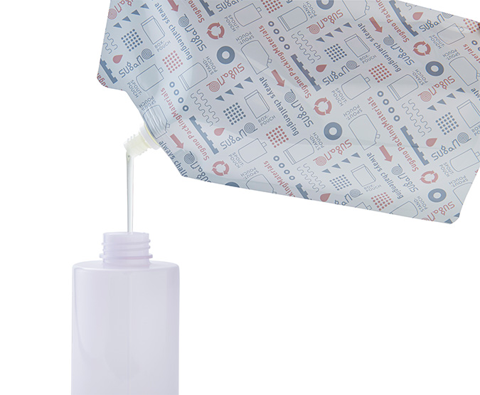 液体〜粘度の高い商品も包装でき、密封性・再封性に優れています。また、スパウトパウチはプラスチックボトルやガラス瓶に比べて軽量かつコンパクトなので、輸送コスト削減・商品の管理も容易です。硬質容器と比較して、プラスチック使用量の大幅削減も叶えられます。