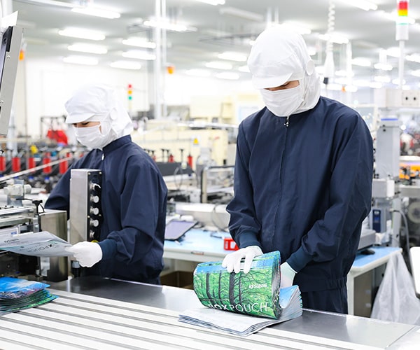 当社では、食品や化粧品、洗剤など幅広い商品に対応した、さまざまな形状のパッケージを製造しています。フィルムの製造から印刷、ラミネートを経て完成したフィルムを、パッケージというカタチに仕上げる仕事です。